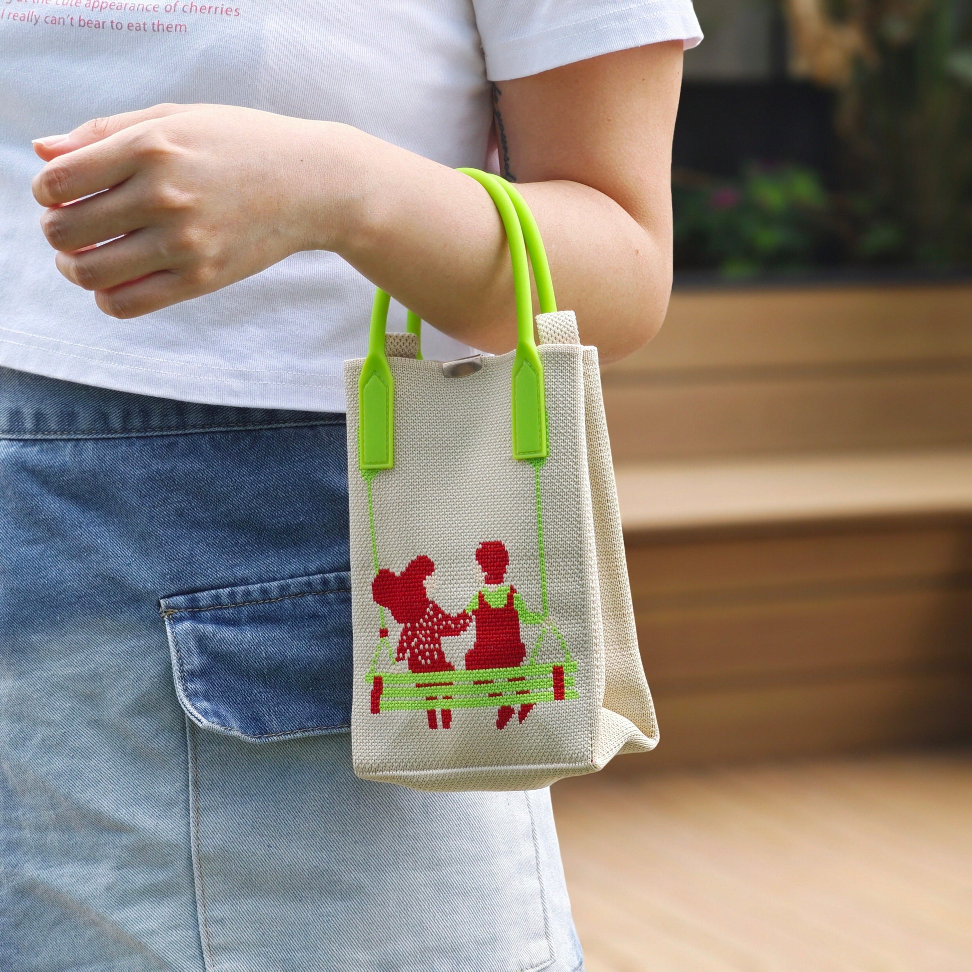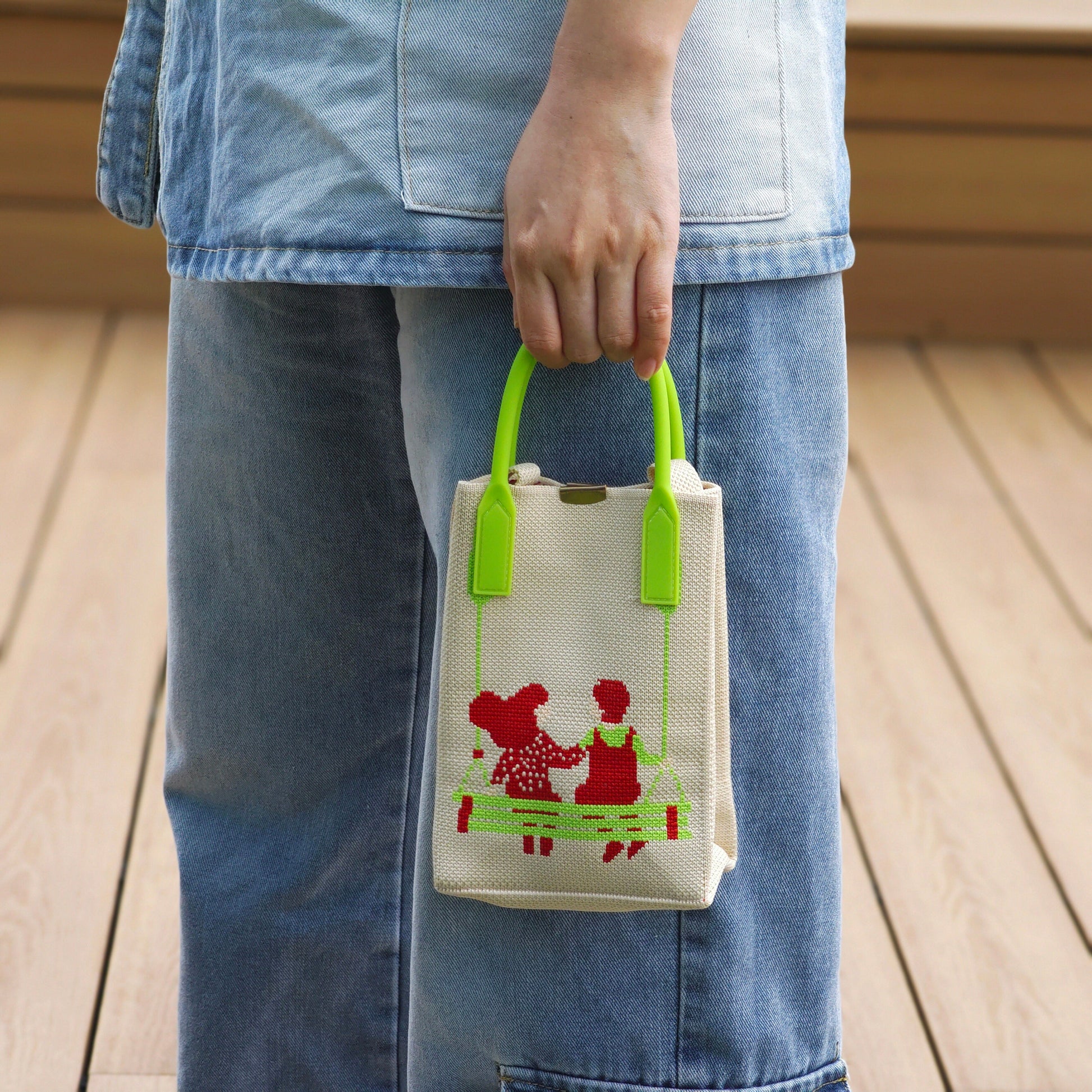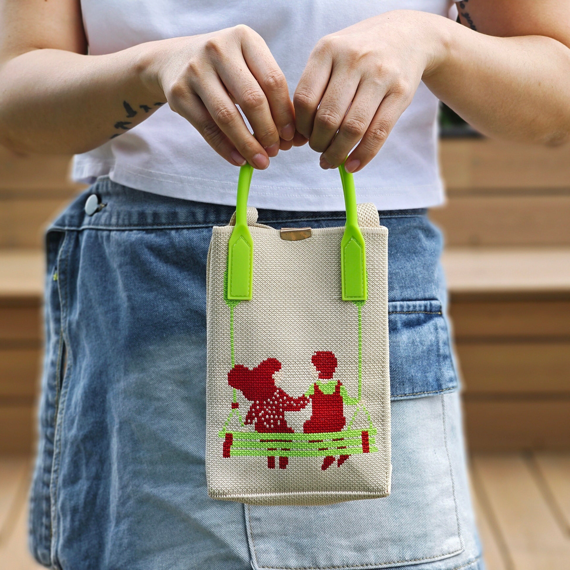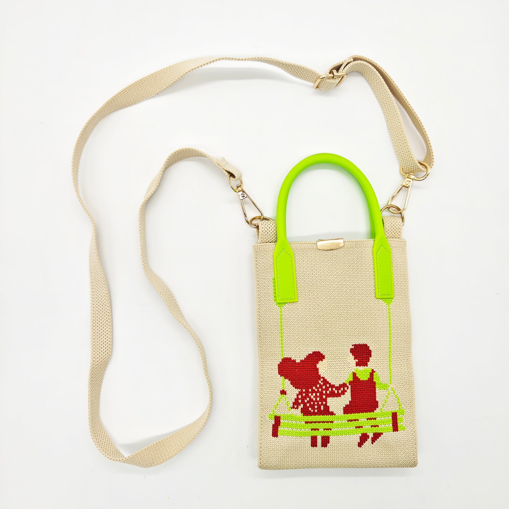 Tell a story without saying a word with this beautifully nostalgic knitted wrist bag. Featuring a charming red silhouette of two girls on a swing, the design sits against a creamy beige canvas with bright green handles—evoking warmth, innocence, and timeless friendship in every stitch.