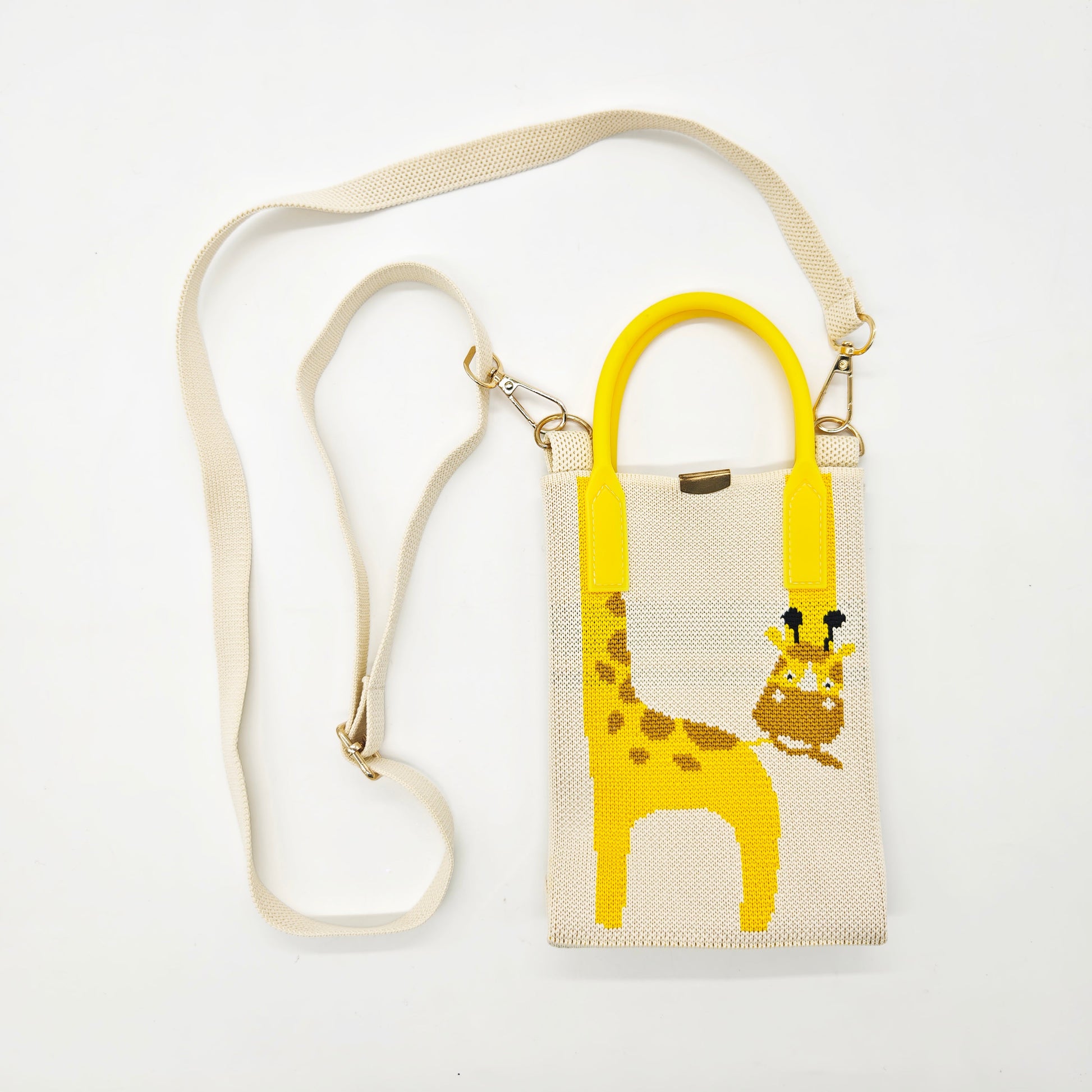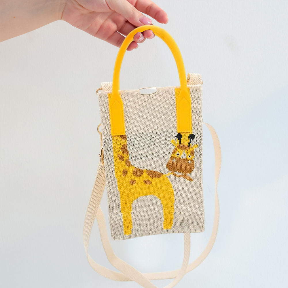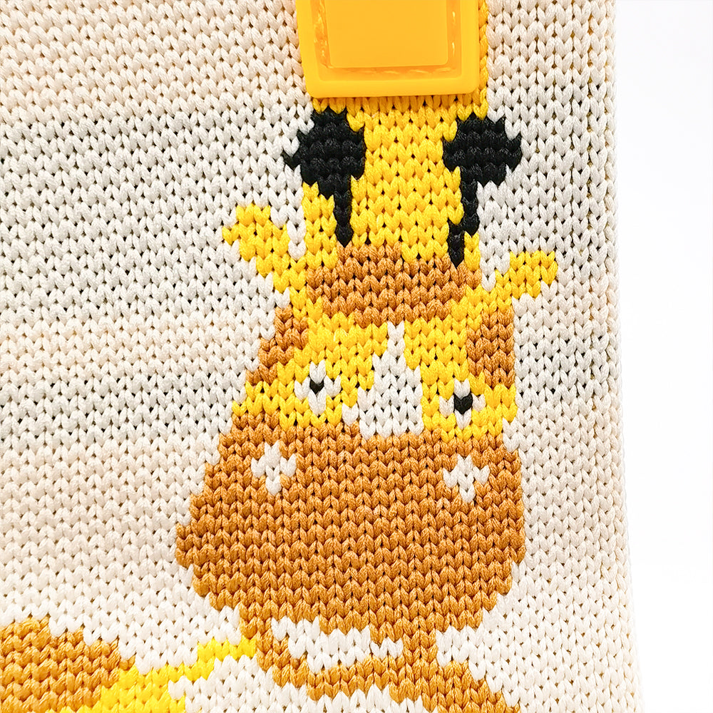 This eye-catching knitted wrist bag brings a playful twist to functional fashion. Featuring a sleek cream canvas and bold yellow accents, the standout detail is a charming giraffe design with its long neck cleverly extending into the handle—blending artful creativity with everyday practicality.