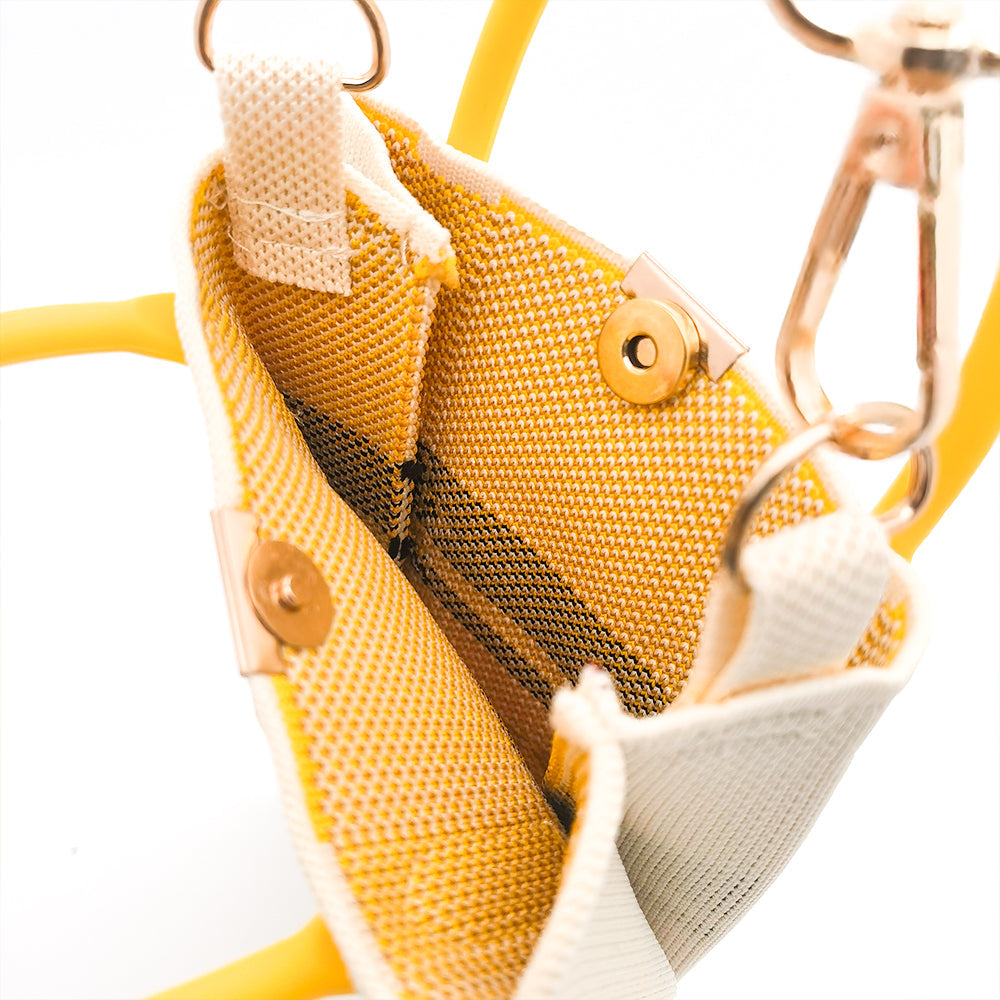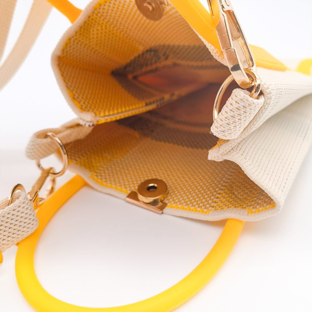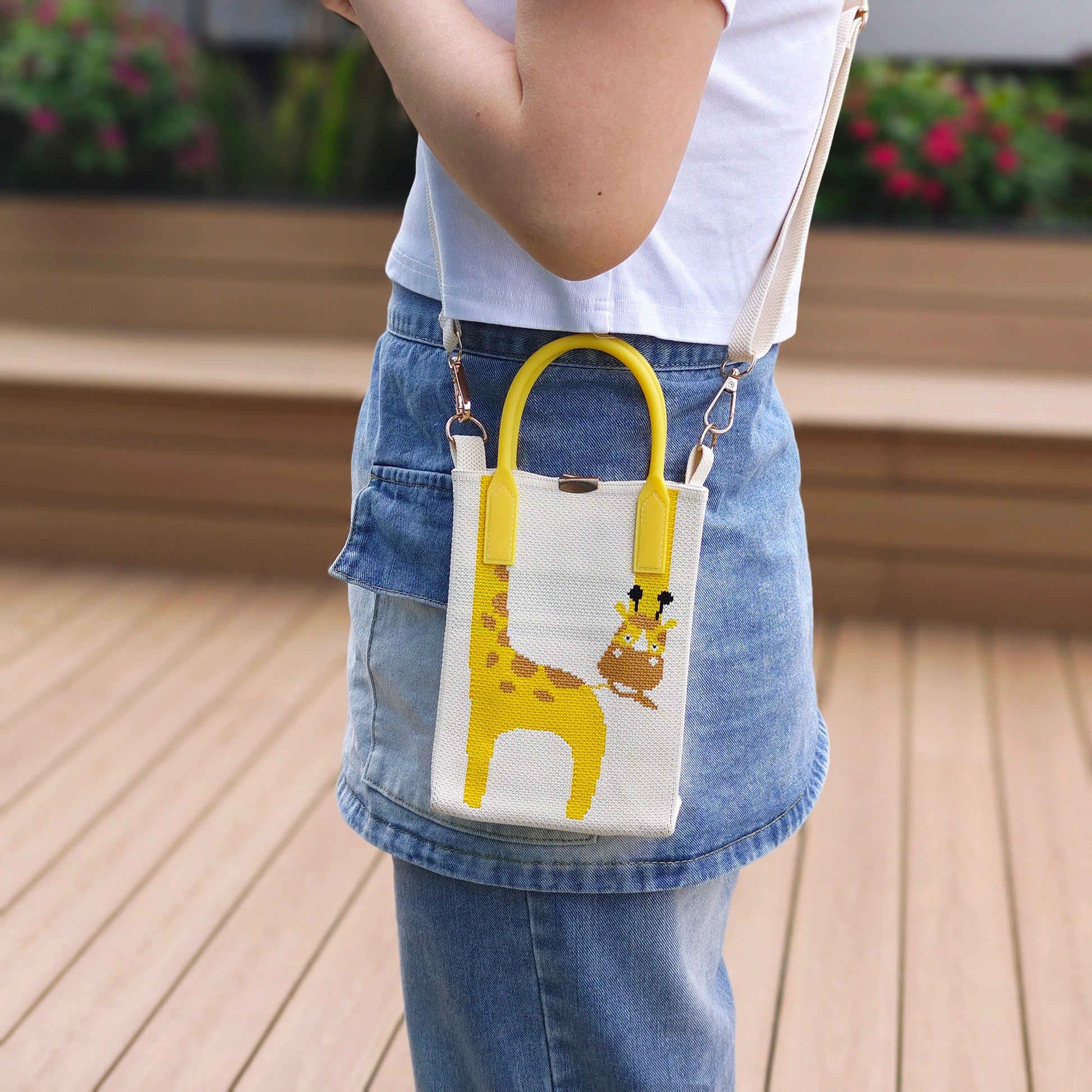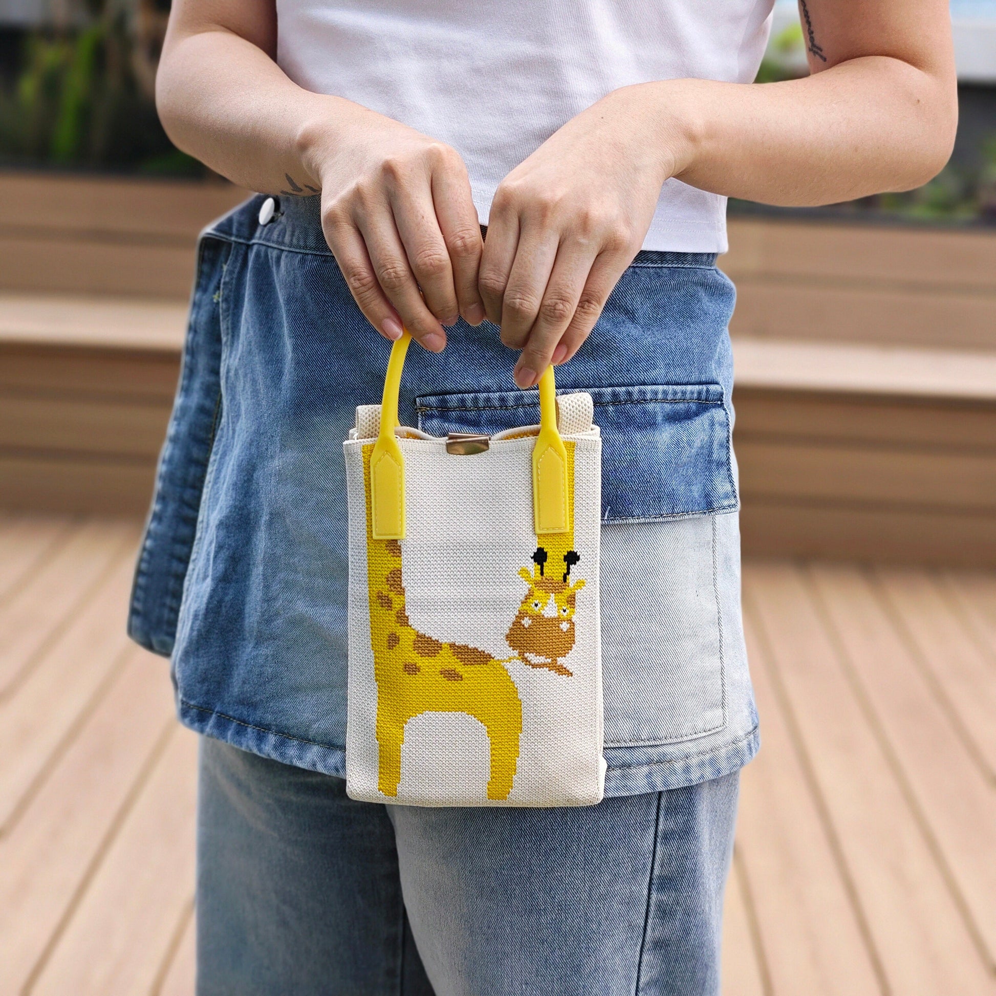 This eye-catching knitted wrist bag brings a playful twist to functional fashion. Featuring a sleek cream canvas and bold yellow accents, the standout detail is a charming giraffe design with its long neck cleverly extending into the handle—blending artful creativity with everyday practicality.